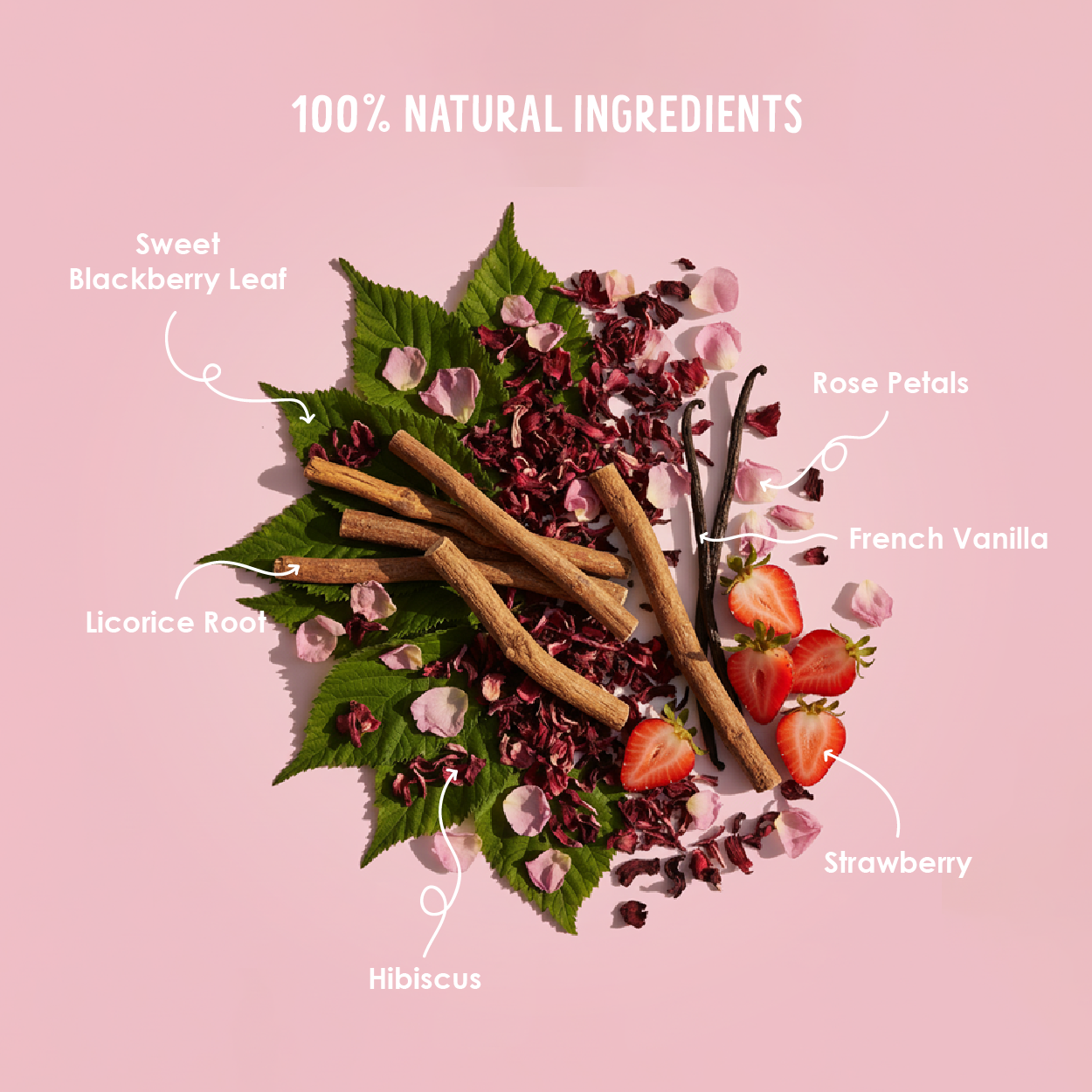 Sweet Blackberry Leaf, Hibiscus, Licorice Root, Rose Petals, Strawberry Flavouring, French Vanilla Flavouring.